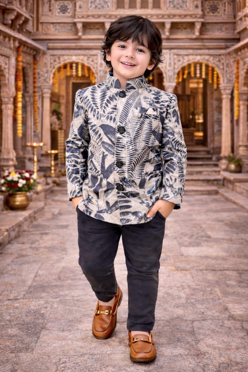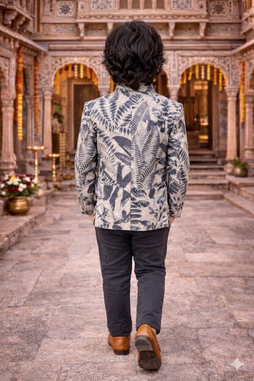 The structured Mandarin-collar blazer is crafted in a warm beige hue, adorned with a striking and unique pattern of detailed dark navy blue fern leaves. The print is dense and covers the entire jacket, giving it an artistic and elegant feel. The front is detailed with classic dark buttons and a neat pocket square, offering a refined “mini-gentleman” look.