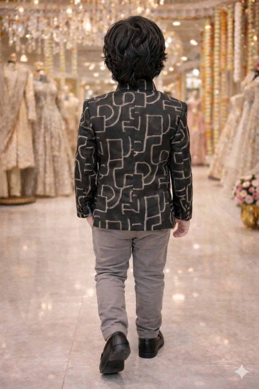 Boys’ Charcoal Abstract Print Indo-Western Blazer & Grey Chino Set