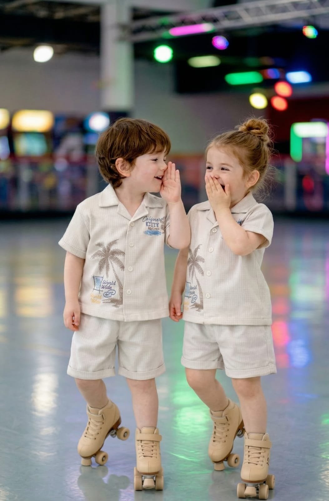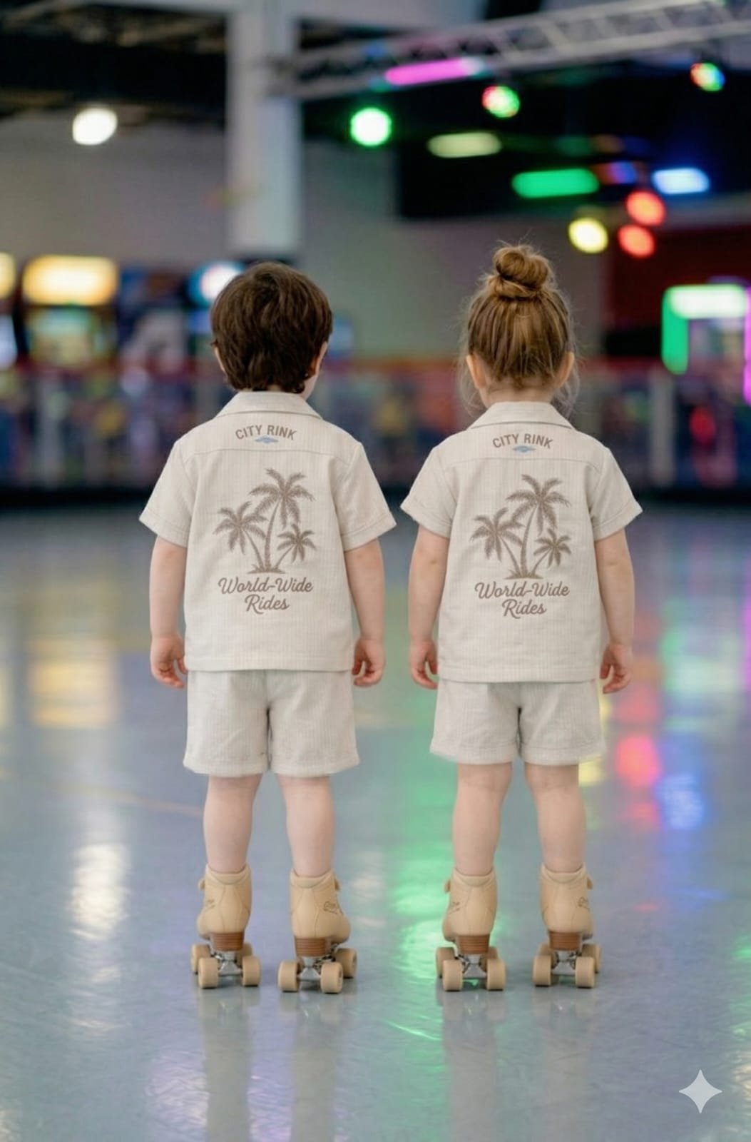 Nothing says “summer fun” like matching sets and roller skates! Our Retro Palm Set is designed for siblings or best friends who want to coordinate in style. Featuring a soft pinstripe texture and vintage-style embroidery, this outfit looks just as good from the back as it does from the front. The lightweight fabric ensures they stay cool while skating, and the neutral tan palette makes it easy to pair with their favorite tan quad skates.
