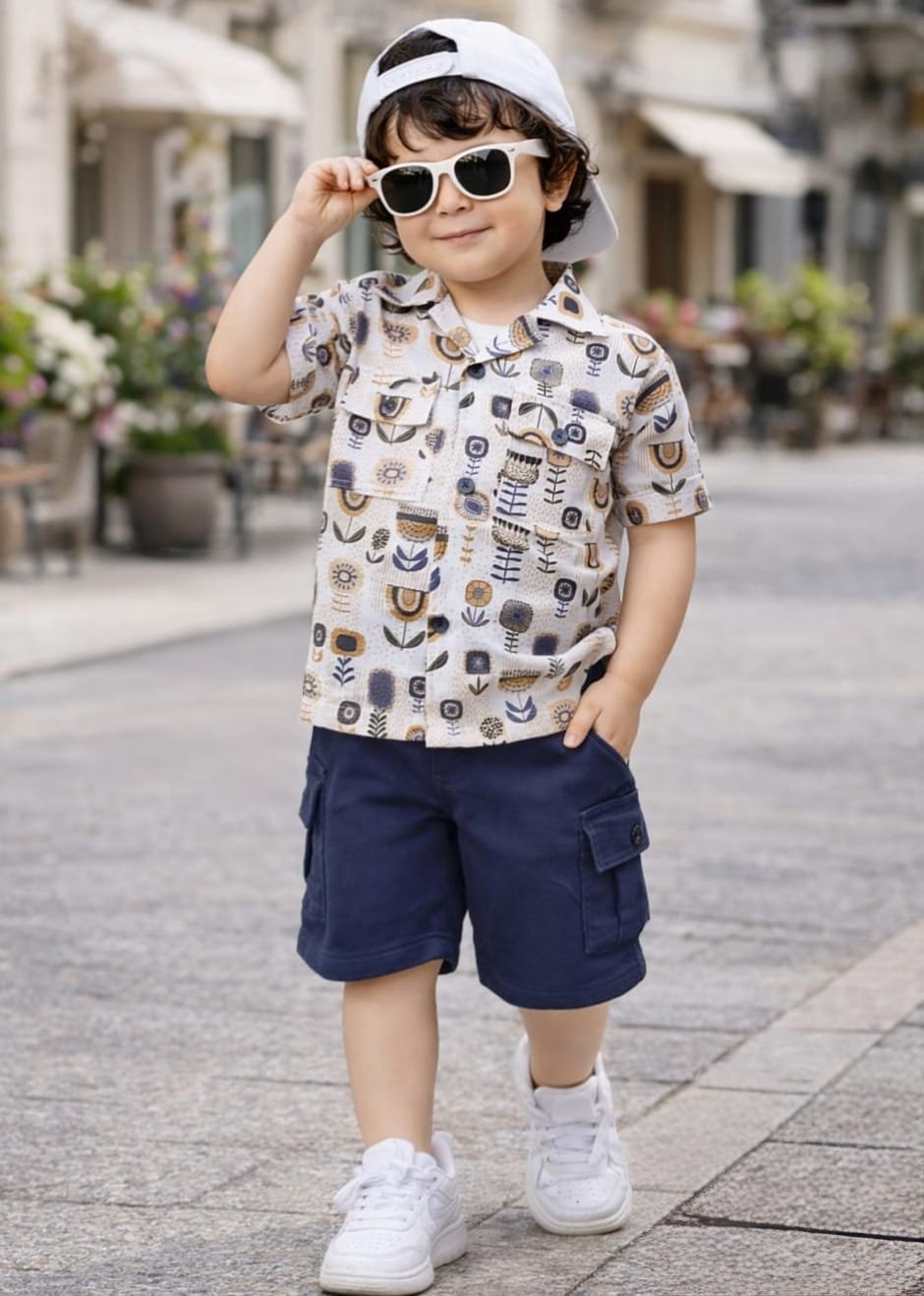 this outfit is perfect for sunny days, playdates, and family outings.Add a splash of vintage charm to your child’s wardrobe with our Retro Geometric Floral Shirt & Navy Cargo Shorts Set.